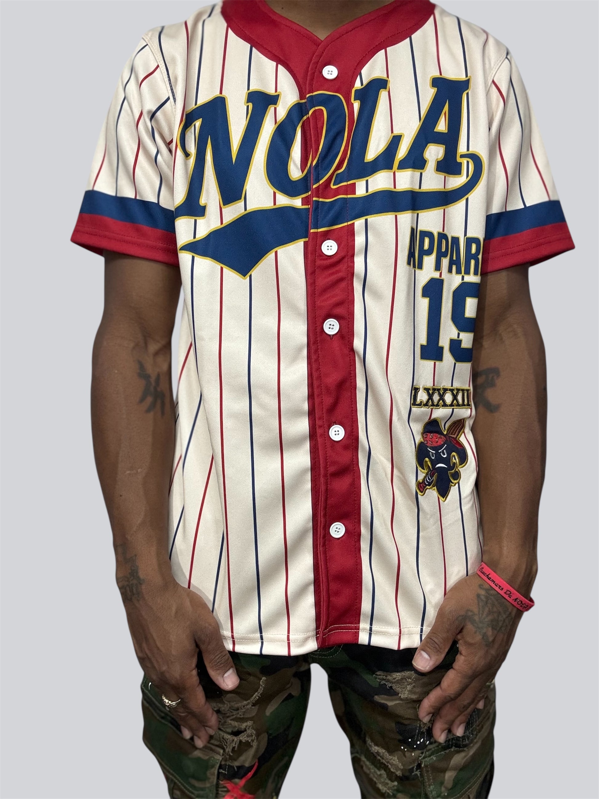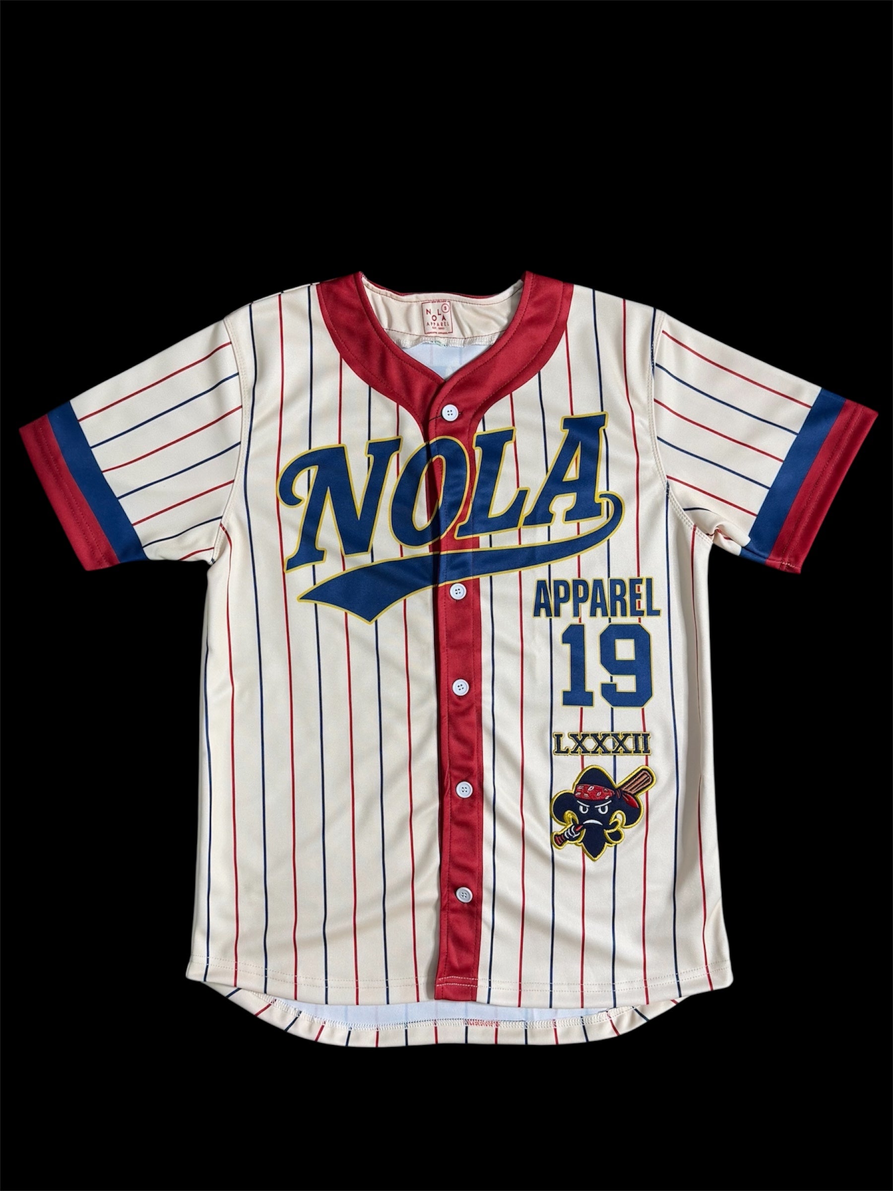 Show off timeless style with a bold twist in the White NOLA Apparel Baseball Jersey, designed with alternating red and blue pinstripes to reflect the heartbeat of the city. Built from Polyester Speedo 220 GSM, this jersey blends premium quality with street-ready flair made for those who grind with purpose.